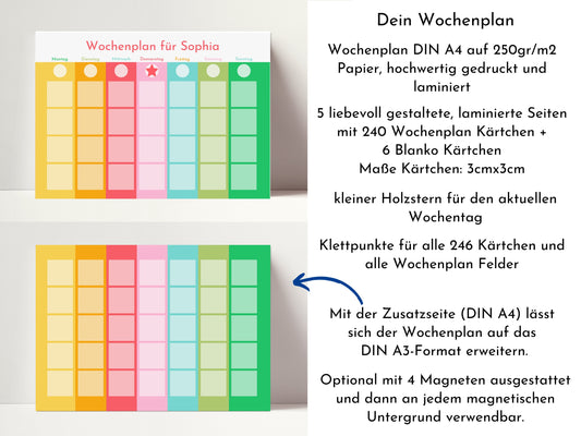 Der bequeme Wochenüberblick für Kinder und Jugendliche. Wochenplan und Kärtchen werden mit kleinen Neodym-Magneten an Kühlschrank oder Magnetboard befestigt.