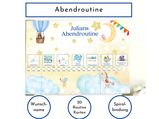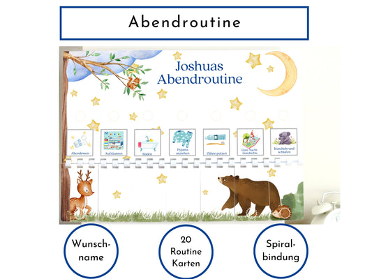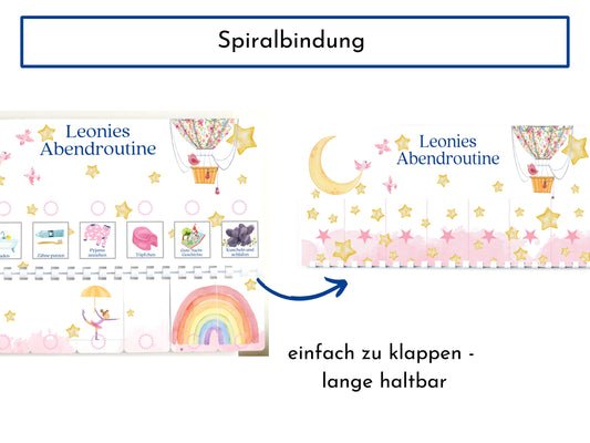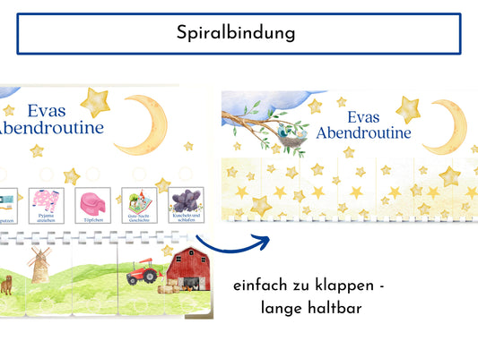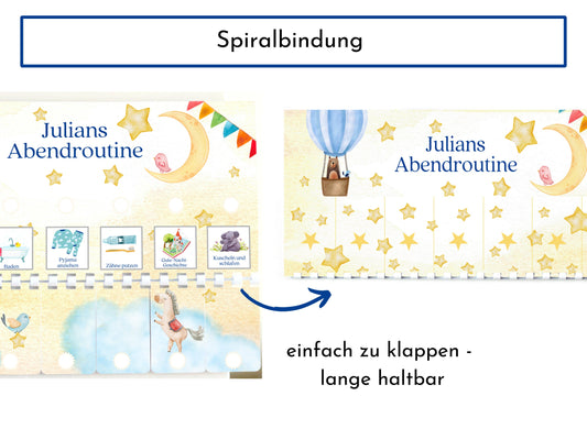 Abendroutine für Kinder, personalisiert, doppelseitig bedruckt, flexible Routine mit 20 Abendroutine Karten, gebunden mit Spiralbindung