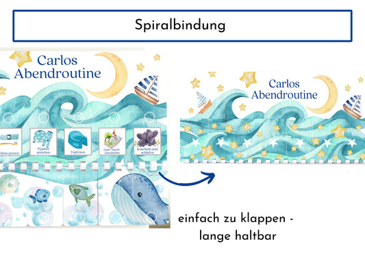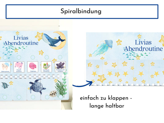 Abendroutine "Meerestiere" für Kinder, personalisiert, doppelseitig bedruckt, flexible Routine mit 20 Abendroutine Karten, Spiralbindung