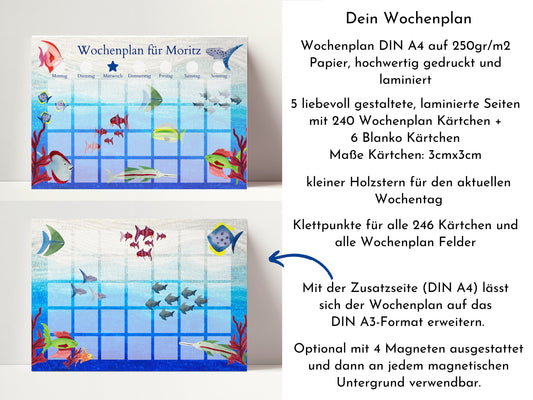 Wochenplan "Aquarium" mit Name personalisiert, 246 Routine Karten, laminiert magnetisch Klett, Routineplan für Kinder und Jugendliche