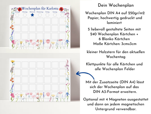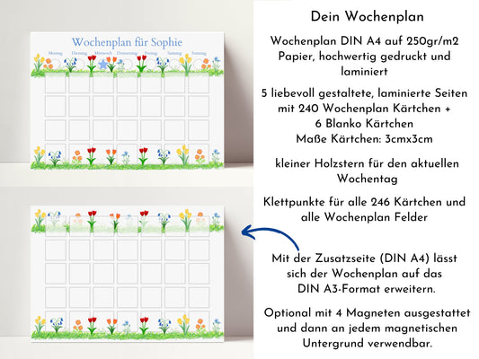 Wochenplan "Frühlingsblumen" mit Name personalisiert, 246 Routine Karten, laminiert magnetisch Klett, Routineplan für Kinder und Jugendliche