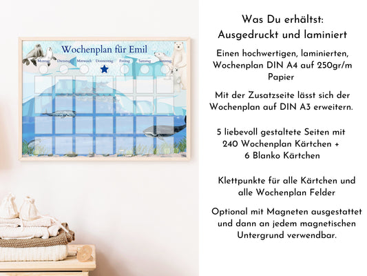 Wochenplaner für Kinder, personalisiert mit 246 Routine Karten, laminiert magnetisch, Geschenkidee für 1. Geburtstag, Wochenplan "Polarmeer"