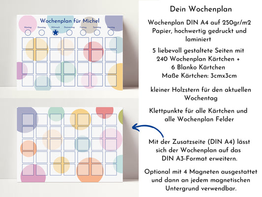 Personalisierter Wochenplan "Bunte Kreise" für Kinder, 246 Wochenkarten, personalisiert, laminiert, magnetisch, Routineplan mit Bildkarten