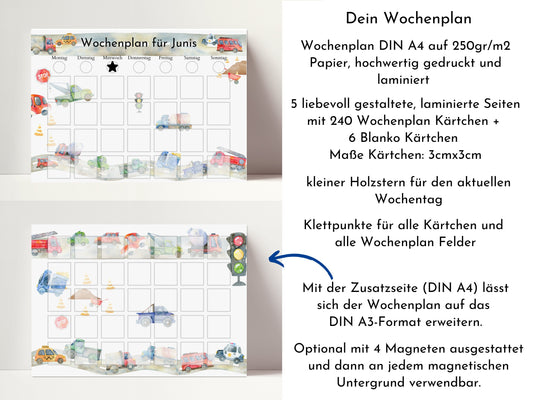 Personalisierter Wochenplan "Autos und Laster" für Kinder, 246 Routine Karten, laminiert, magnetisch, Montessori Routineplan mit Bildkarten