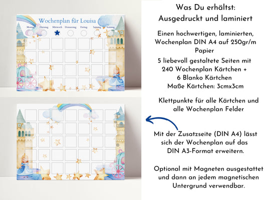 Wochenplaner mit 246 Routine Karten, personalisiert für Kinder, Geschenkidee 1. Geburtstag, laminiert magnetisch, Wochenplan "Prinzessin"