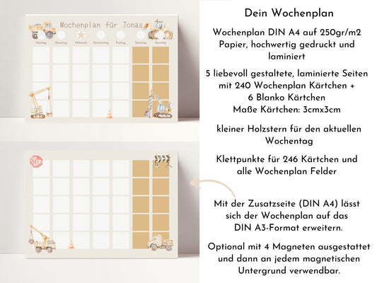Wochenplan "Baustelle" mit Name personalisiert, 246 Routine Karten, laminiert, magnetisch, Montessori Routineplan mit Bildkarten für Kinder