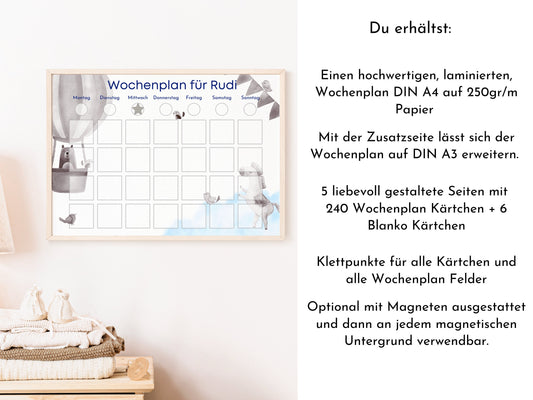 Wochenplaner für Kinder mit 246 Routine Karten, laminiert magnetisch personalisiert, Geschenkidee 1 Geburtstag, Wochenplan "Heissluftballon"
