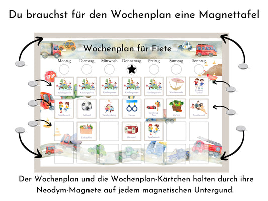 Magnetboard Wochenplan "Autos und Laster" personalisiert für Kinder, 246 Routine Karten, Neodym-Magnete, Routineplan Familie Nordstern