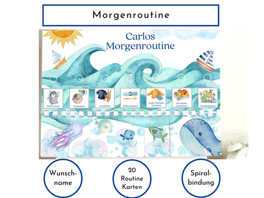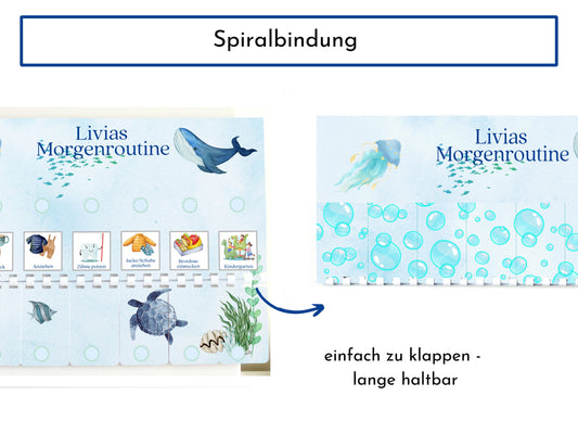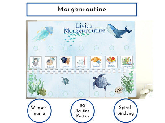 Personalisierte Morgenroutine "Wal und Meer" für Kinder, Routineplan mit 20 Routine Karten, doppelseitig bedruckt mit Spiralbindung