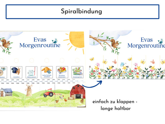 Morgenroutine für Kinder, personalisiert, doppelseitig bedruckt, flexible Routine mit 20 Morgenroutine Karten, gebunden mit Spiralbindung