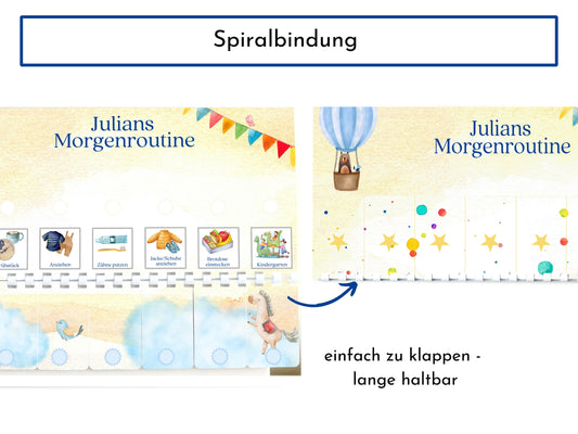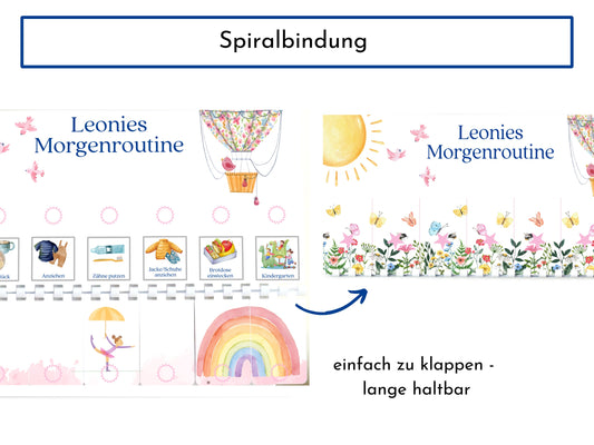 Personalisierte Morgenroutine für Kinder, flexible Routine mit 20 Morgenroutine Karten, Spiralbindung Routineplan "Heissluftballon"