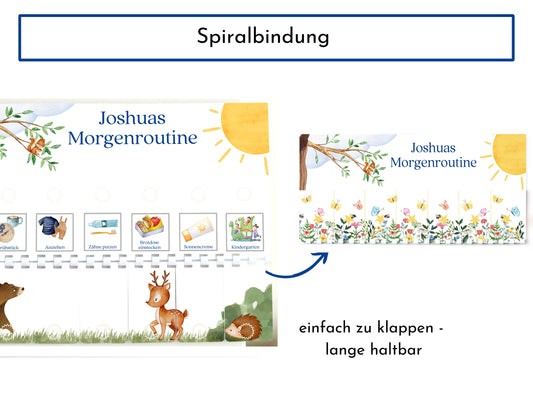 Morgenroutine "Reh und Bär" für Kinder, personalisiert, doppelseitig bedruckt, flexible Routine mit 20 Morgenroutine Karten, Spiralbindung