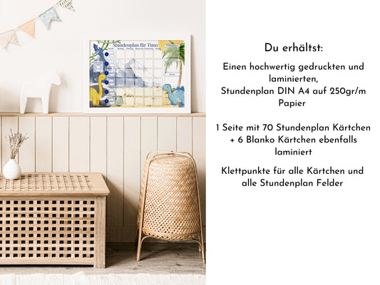 Stundenplan mit 70 Schulfach-Kärtchen, personalisiert, abwischbar laminiert magnetisch, Einschulung Grundschule Schulanfang Geschenk "Dinos"