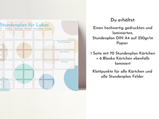 Stundenplan mit 70 Schulfach Kärtchen, personalisiert für die Grundschule, laminiert magnetisch, Geschenkidee Einschulung "Kreise Strand"