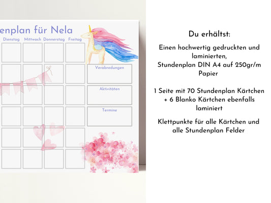 Stundenplan mit 70 Schulfach Karten, personalisiert für die Grundschule, abwischbar laminiert magnetisch, Geschenk Einschulung "Einhorn"