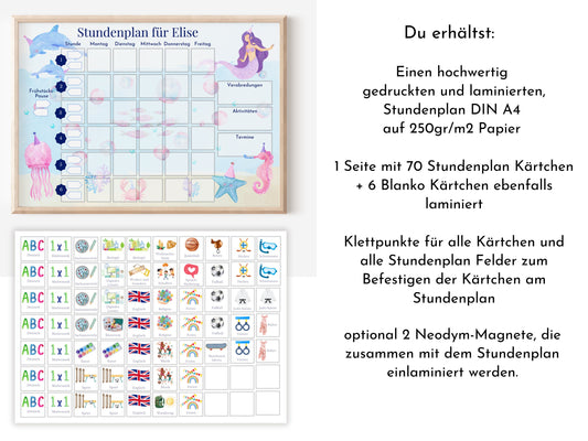 Stundenplan "Meerjungfrau" mit 70 Schulfach Kärtchen, personalisiert für die Grundschule, laminiert, magnetisch, Geschenkidee Einschulung