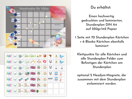 Stundenplan "Astronaut" mit 70 Schulfach Kärtchen, personalisiert für die Grundschule, laminiert abwischbar magnetisch, Geschenk Einschulung