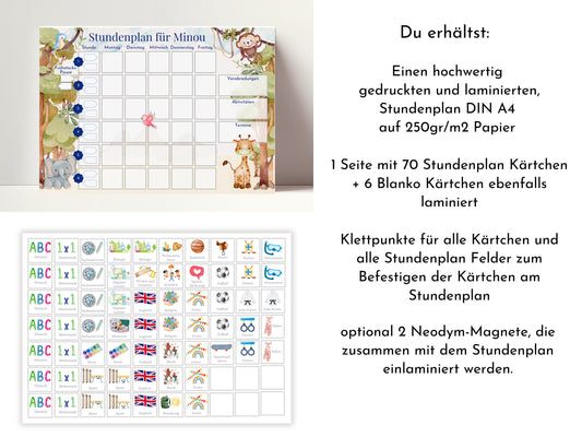 Stundenplan "Urwald" mit 70 Schulfach Kärtchen, personalisiert für die Grundschule, laminiert, magnetisch, Geschenkidee Einschulung