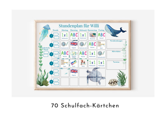 Stundenplan mit 70 Schulfach Kärtchen, personalisiert für die Grundschule, laminiert magnetisch abwischbar, Geschenkidee Einschulung "Ozean"