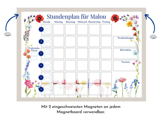 Stundenplan "Blumenwiese" mit 70 Schulfach Kärtchen, personalisiert, Stundentafel laminiert abwischbar magnetisch, Geschenk Einschulung