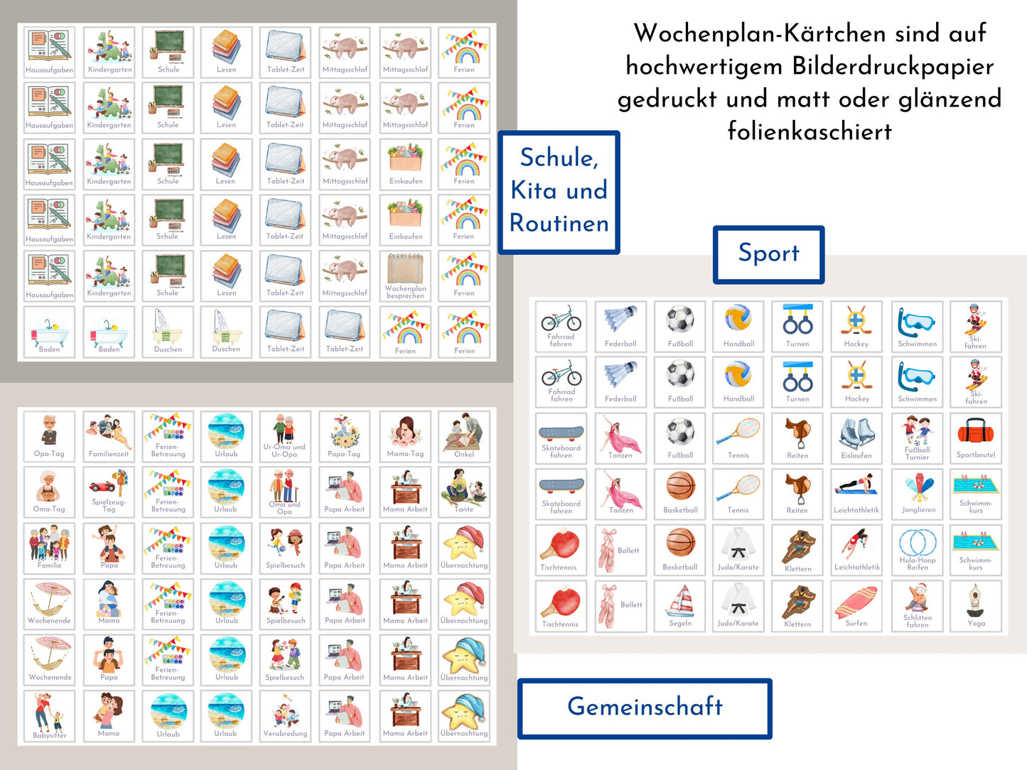 - 5 liebevoll gestaltete, DIN A4 Seiten mit 240 Wochenplan Kärtchen + 6 Blanko Kärtchen. Die Wochenplan-Kärtchen werden auf hochwertigem 350g Bilderdruckpapier gedruckt und matt folienkaschiert. Der personalisierte Wochenplan wird auf professionellem 260g Fotodruckpapier gedruckt und mit 125 mic Folien laminiert.